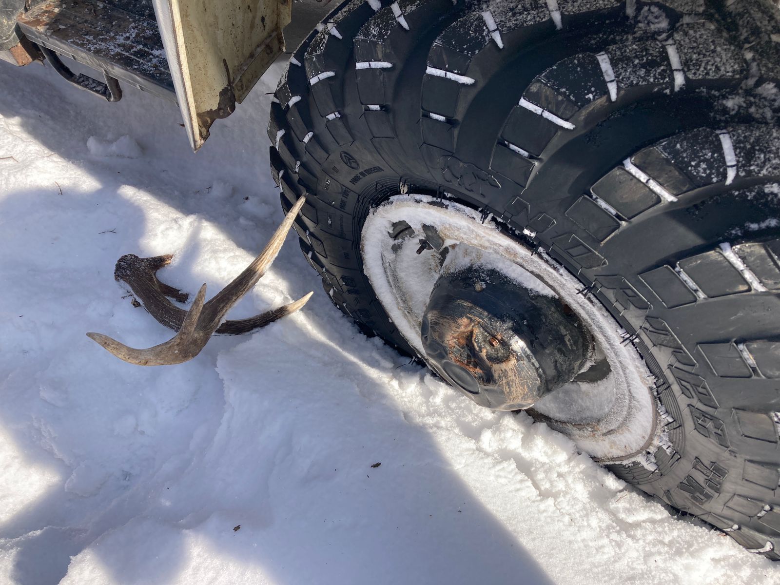 По дороге до места у машины сопровождения сотрудников «БАСТАКА» случился курьезный для нас и не приятный для них случай. Ровно под колесом в снегу оказался невидимый осенний лосинный рог. Этот рог пробил сбоку новое колесо и обездвижил колонну почти на час, пока ставили запасное колесо, в итоге – колесо на выброс. Вот так оказывается животные у себя дома могут повредить технику непрошенных гостей и остановить движение.